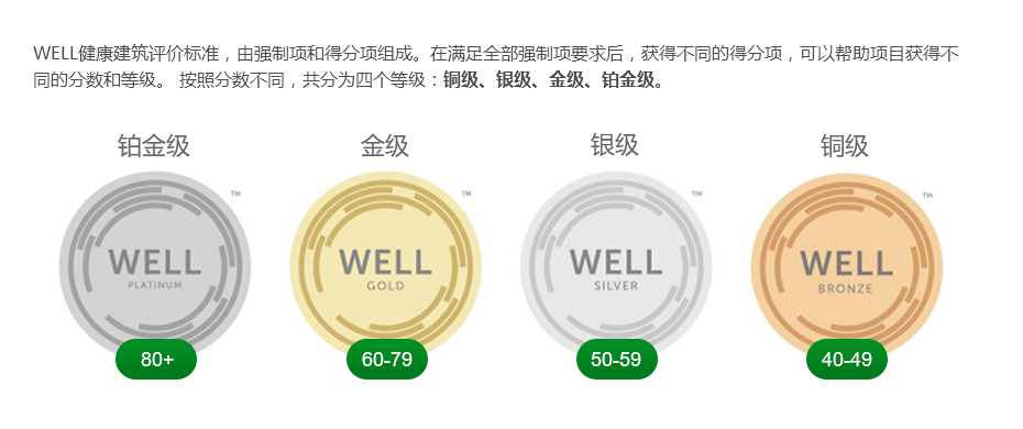 WELL认证级别分铜级、银级、金级和铂金级4档