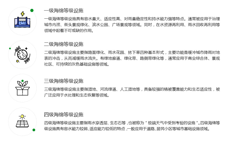 国家标准《海绵城市建设评价标准》由住房城乡建设部组织制订,旨在规范海绵城市建设效果的评价、提升海绵城市建设的系统性。海绵等级是指海绵城市建设中不同类型海绵设施的容水能力和适应能力指数。当前,根据不同的海绵设施类型(如屋顶绿化、花园农业、湿地公园等)分为一级、二级、三级、四级四个等级。其中,一级海绵等级设施具备较高的容水灵敏度、适应性和可扩展性,可以快速抵御极端降水,是海绵城市建设中的核心块、拦塞坝和水库等最重要的基础设施。