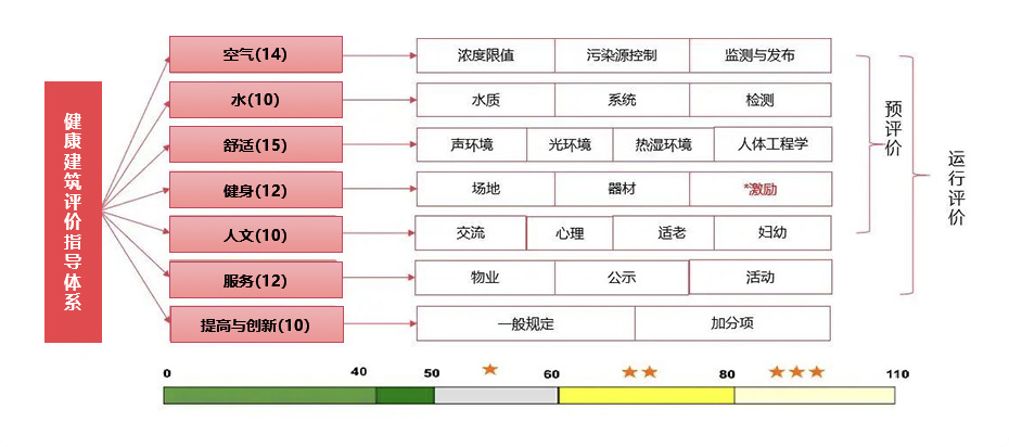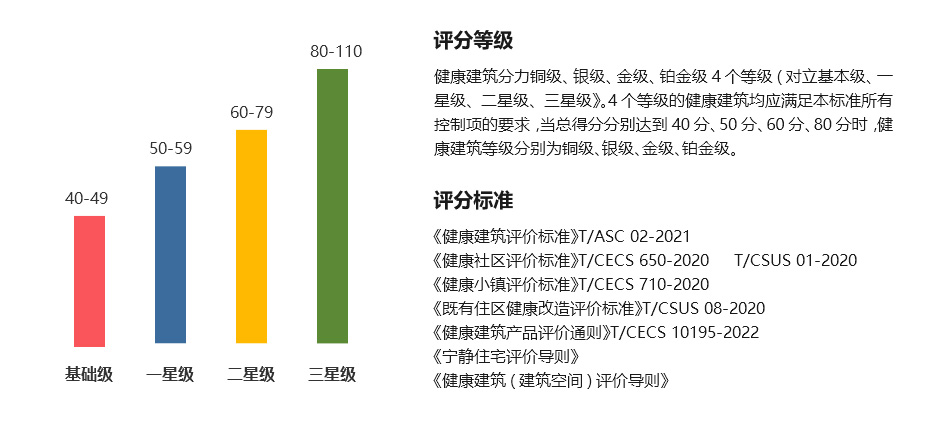 健康建筑认证的满分为110分,当建筑满足所有控制项要求,且总得分达到40分、50分、60分、80分时,分别达到四个等级。