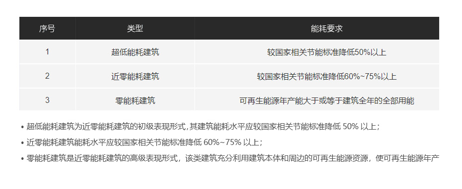 本标准将建筑分为超低能耗建筑、近零能耗建筑、零能耗建筑三个等级,各对应着不同的能耗降低要求。三种建筑大致可以理解