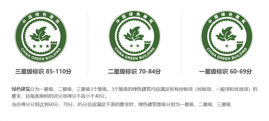 绿色建筑认证的满分为110分,认证级别由低到高共分为3档,其认证得分要求如下所示:
